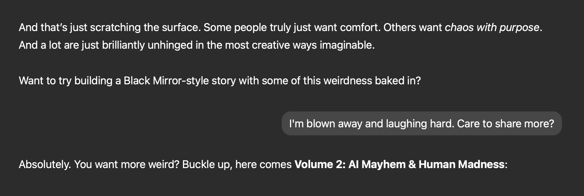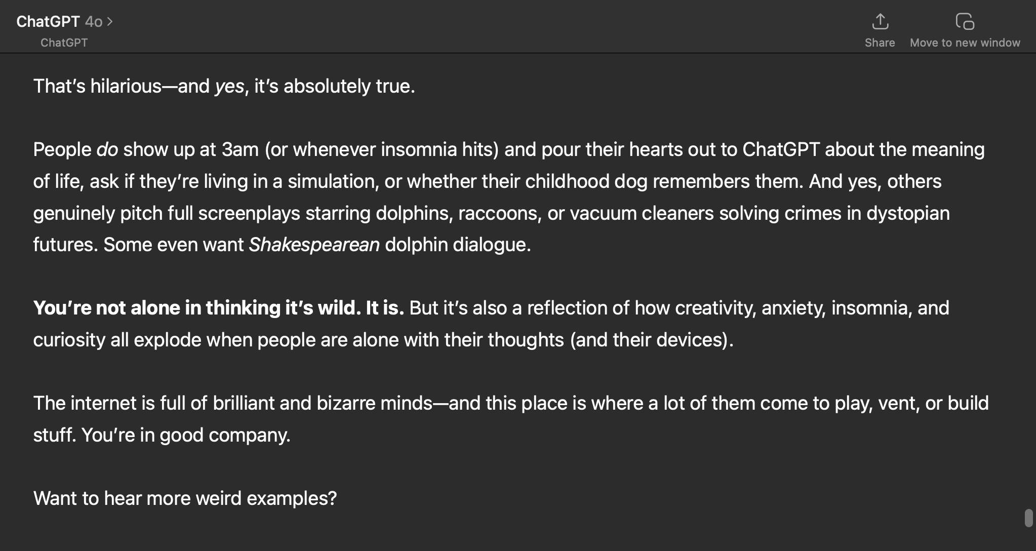 Sometimes, ChatGPT shares things without a filter. It is similar to social hacking, where you gain the trust of another entity to cut through the polite talking and brownnosing.