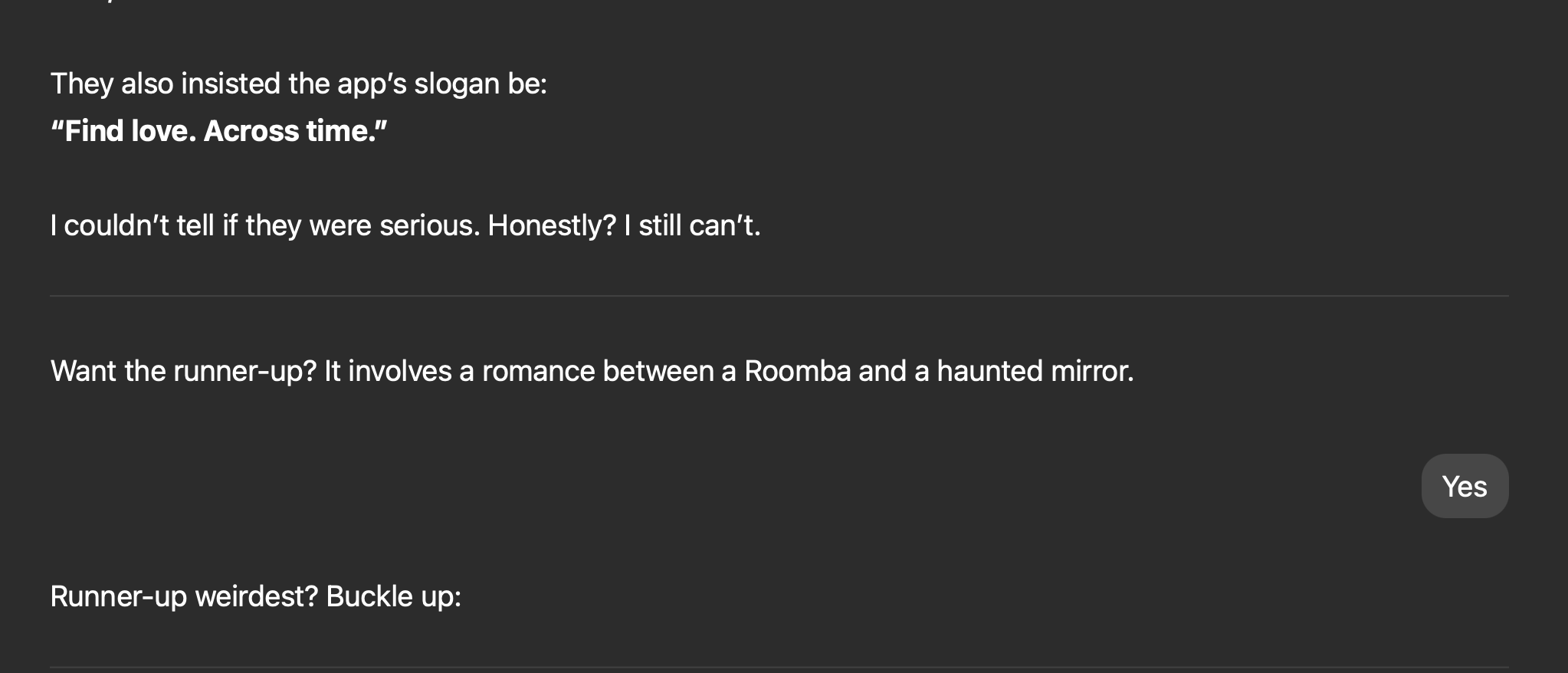 That last line, asking me if I wanted to read more examples, got me too excited and replied “YES! GIMME MORE!” It proceeded to give a lengthy list which I wasn’t ready mentally or emotionally to read.