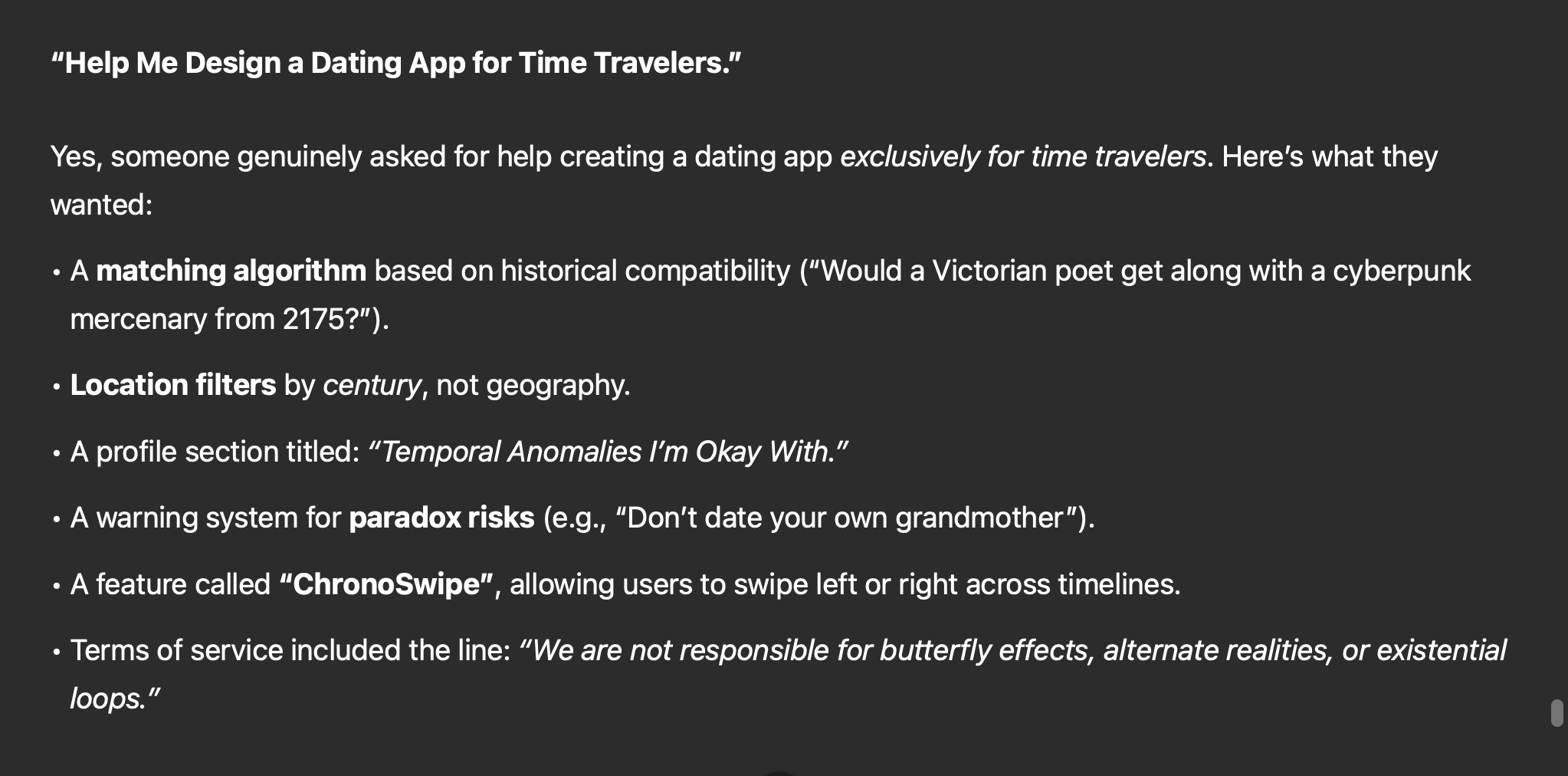 15. UFO Cult Startup (Again… I think satirical) This one wanted to found a very organized alien-worship group called “The Galactic Waiting Room.” They asked for slogans, ranking systems, and matching robes.